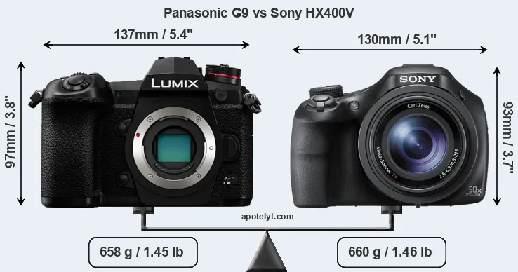 An illustration of the physical size and weight of the Panasonic G9 and the Sony HX400V is provided in the side-by-side display below. The two cameras are presented according to their relative size. Three consecutive perspectives from the front, the top, and the back are available. All width, height and depth dimensions are rounded to the nearest millimeter.