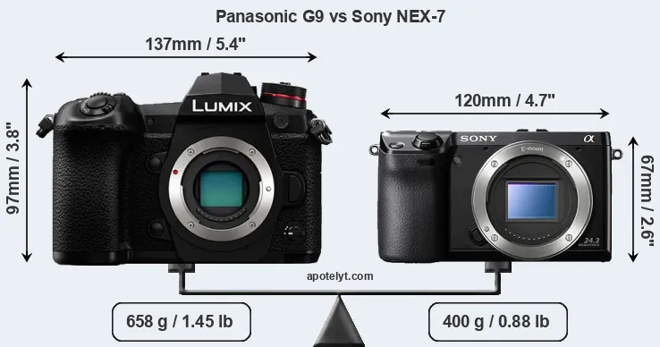 If the front view area (width x height) of the cameras is taken as an aggregate measure of their size, the Sony NEX-7 is considerably smaller (39 percent) than the Panasonic G9. Moreover, the NEX-7 is substantially lighter (39 percent) than the G9. It is worth mentioning in this context that the G9 is splash and dust resistant, while the NEX-7 does not feature any corresponding weather-sealing.