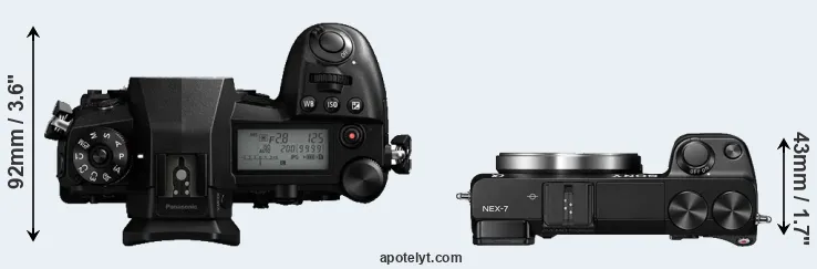 The physical size and weight of the Panasonic G9 and the Sony NEX-7 are illustrated in the side-by-side display below. The two cameras are presented according to their relative size. Three successive views from the front, the top, and the rear are shown. All size dimensions are rounded to the nearest millimeter.