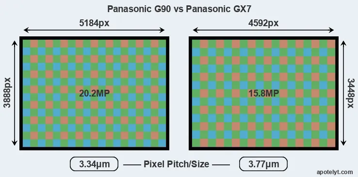 While the two cameras under review share the same sensor size, the G90 offers a higher resolution of 20.2 megapixels, compared with 15.8 MP of the GX7. This megapixels advantage translates into a 13 percent gain in linear resolution. On the other hand, these sensor specs imply that the G90 has a higher pixel density and a smaller size of the individual pixel (with a pixel pitch of 3.34μm versus 3.77μm for the GX7). In this context, it should be noted, however, that the G90 is much more recent (by 5 years and 8 months) than the GX7, and its sensor will have benefitted from technological advances during this time that compensate for the smaller pixel size. Coming back to sensor resolution, it should be mentioned that the G90 has no anti-alias filter installed, so that it can capture all the detail its sensor resolves.