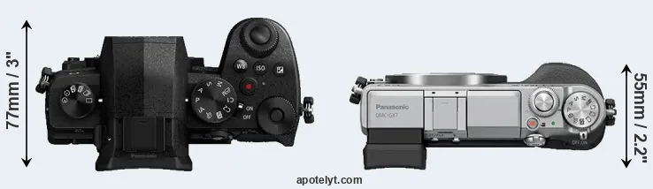 The physical size and weight of the Panasonic G90 and the Panasonic GX7 are illustrated in the side-by-side display below. The two cameras are presented according to their relative size. Three successive views from the front, the top, and the rear are shown. All width, height and depth dimensions are rounded to the nearest millimeter.