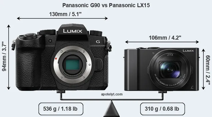 If the front view area (width x height) of the cameras is taken as an aggregate measure of their size, the Panasonic LX15 is considerably smaller (48 percent) than the Panasonic G90. It is worth mentioning in this context that the G90 is splash and dust resistant, while the LX15 does not feature any corresponding weather-sealing.
