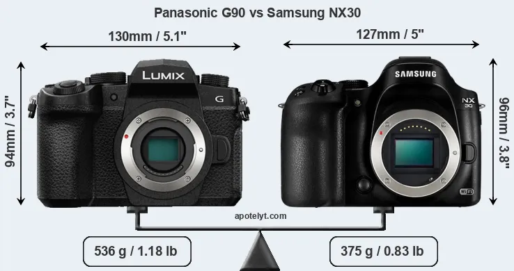If the front view area (width x height) of the cameras is taken as an aggregate measure of their size, the Panasonic G90 and the Samsung NX30 are of equal size. However, the NX30 is markedly lighter (30 percent) than the G90. It is worth mentioning in this context that the G90 is splash and dust resistant, while the NX30 does not feature any corresponding weather-sealing.