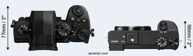The physical size and weight of the Panasonic G90 and the Sony A6400 are illustrated in the side-by-side display below. The two cameras are presented according to their relative size. Three consecutive views from the front, the top, and the rear side are shown. All size dimensions are rounded to the nearest millimeter.