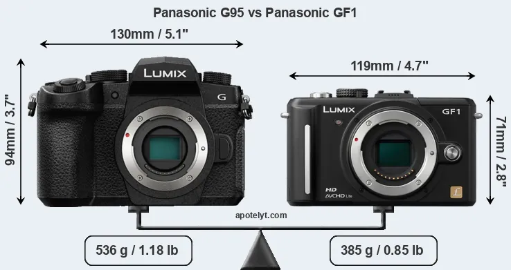 If the front view area (width x height) of the cameras is taken as an aggregate measure of their size, the Panasonic GF1 is considerably smaller (31 percent) than the Panasonic G95. Moreover, the GF1 is markedly lighter (28 percent) than the G95. It is worth mentioning in this context that the G95 is splash and dust resistant, while the GF1 does not feature any corresponding weather-sealing.