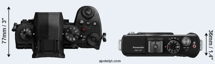 The physical size and weight of the Panasonic G95 and the Panasonic GF1 are illustrated in the side-by-side display below. The two cameras are presented according to their relative size. Three consecutive perspectives from the front, the top, and the back are available. All size dimensions are rounded to the nearest millimeter.