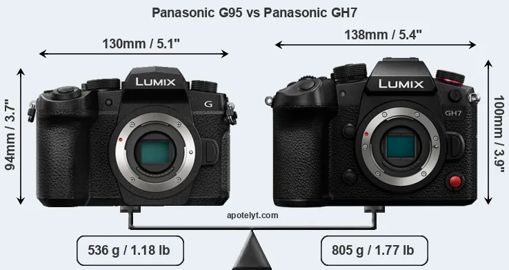 The physical size and weight of the Panasonic G95 and the Panasonic GH7 are illustrated in the side-by-side display below. The two cameras are presented according to their relative size. Three consecutive perspectives from the front, the top, and the back are available. All width, height and depth measures are rounded to the nearest millimeter.
