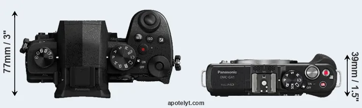 The side-by-side display below illustrates the physical size and weight of the Panasonic G95 and the Panasonic GX1. The two cameras are presented according to their relative size. Three consecutive views from the front, the top, and the rear side are shown. All width, height and depth dimensions are rounded to the nearest millimeter.