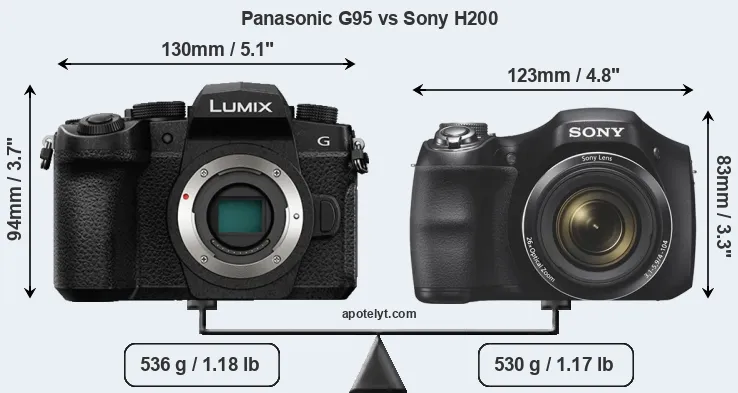 An illustration of the physical size and weight of the Panasonic G95 and the Sony H200 is provided in the side-by-side display below. The two cameras are presented according to their relative size. Three consecutive perspectives from the front, the top, and the back are available. All size dimensions are rounded to the nearest millimeter.