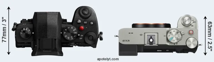 The physical size and weight of the Panasonic G97 and the Sony A7C R are illustrated in the side-by-side display below. The two cameras are presented according to their relative size. Three consecutive perspectives from the front, the top, and the back are available. All width, height and depth dimensions are rounded to the nearest millimeter.
