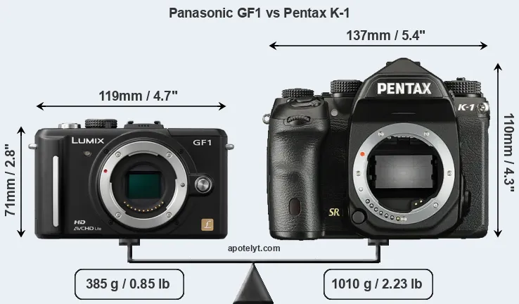 If the front view area (width x height) of the cameras is taken as an aggregate measure of their size, the Pentax K-1 is considerably larger (78 percent) than the Panasonic GF1. Moreover, the K-1 is substantially heavier (162 percent) than the GF1. It is noteworthy in this context that the K-1 is splash and dust-proof, while the GF1 does not feature any corresponding weather-sealing.