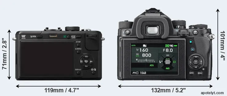 The physical size and weight of the Panasonic GF1 and the Pentax KP are illustrated in the side-by-side display below. The two cameras are presented according to their relative size. Three consecutive perspectives from the front, the top, and the back are available. All size dimensions are rounded to the nearest millimeter.