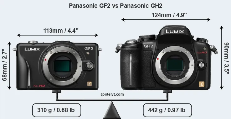 If the front view area (width x height) of the cameras is taken as an aggregate measure of their size, the Panasonic GH2 is considerably larger (45 percent) than the Panasonic GF2. Moreover, the GH2 is substantially heavier (43 percent) than the GF2. In this context, it is worth noting that neither the GF2 nor the GH2 are weather-sealed.