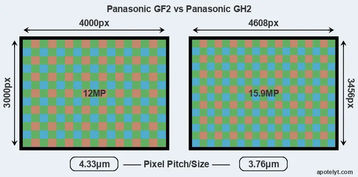 While the two cameras under review share the same sensor size, the GH2 offers a higher resolution of 15.9 megapixels, compared with 12 MP of the GF2. This megapixels advantage translates into a 15 percent gain in linear resolution. On the other hand, these sensor specs imply that the GH2 has a higher pixel density and a smaller size of the individual pixel (with a pixel pitch of 3.76μm versus 4.33μm for the GF2). It is noteworthy in this context that the two cameras were released in close succession, so that their sensors are from the same technological generation.