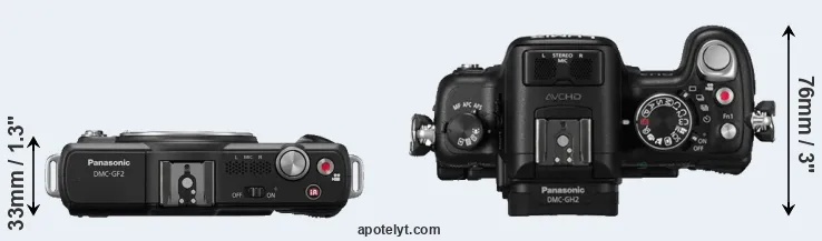 The physical size and weight of the Panasonic GF2 and the Panasonic GH2 are illustrated in the side-by-side display below. The two cameras are presented according to their relative size. Three consecutive perspectives from the front, the top, and the back are available. All width, height and depth dimensions are rounded to the nearest millimeter.