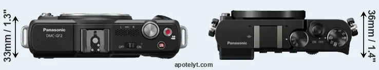 The side-by-side display below illustrates the physical size and weight of the Panasonic GF2 and the Panasonic GM5. The two cameras are presented according to their relative size. Three successive views from the front, the top, and the rear are shown. All size dimensions are rounded to the nearest millimeter.