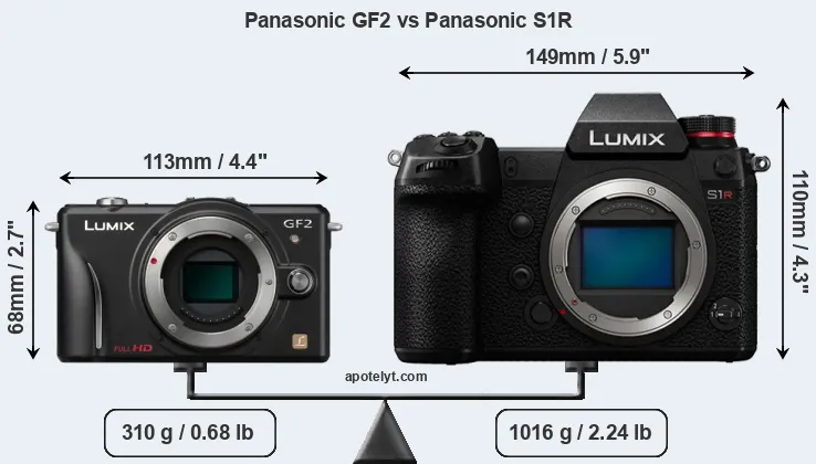 If the front view area (width x height) of the cameras is taken as an aggregate measure of their size, the Panasonic S1R is considerably larger (113 percent) than the Panasonic GF2. Moreover, the S1R is substantially heavier (228 percent) than the GF2. It is noteworthy in this context that the S1R is splash and dust-proof, while the GF2 does not feature any corresponding weather-sealing.