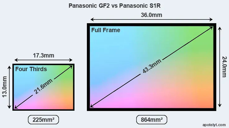 Of the two cameras under consideration, the Panasonic GF2 features a Four Thirds sensor and the Panasonic S1R a full frame sensor. The sensor area in the S1R is 284 percent bigger. As a result of these sensor size differences, the cameras have a format factor of, respectively, 2.0 and 1.0. The sensor in the GF2 has a native 4:3 aspect ratio, while the one in the S1R offers a 3:2 aspect.