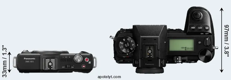 The physical size and weight of the Panasonic GF2 and the Panasonic S1R are illustrated in the side-by-side display below. The two cameras are presented according to their relative size. Three consecutive views from the front, the top, and the rear side are shown. All size dimensions are rounded to the nearest millimeter.