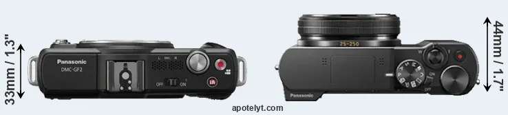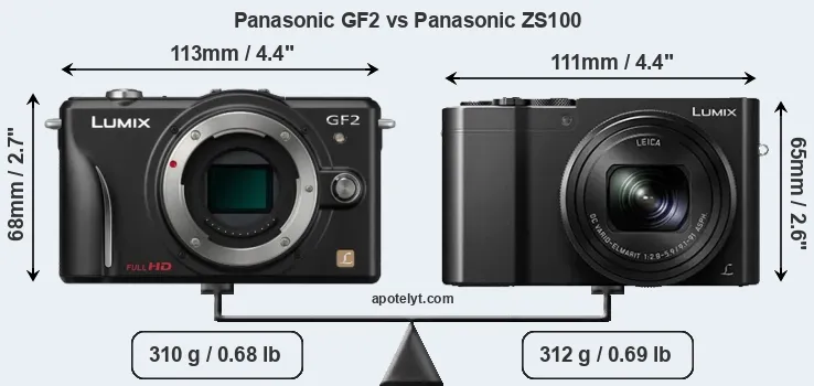 An illustration of the physical size and weight of the Panasonic GF2 and the Panasonic ZS100 is provided in the side-by-side display below. The two cameras are presented according to their relative size. Three successive views from the front, the top, and the rear are shown. All size dimensions are rounded to the nearest millimeter.