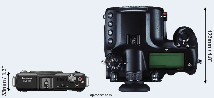 An illustration of the physical size and weight of the Panasonic GF2 and the Pentax 645Z is provided in the side-by-side display below. The two cameras are presented according to their relative size. Three consecutive views from the front, the top, and the rear side are shown. All width, height and depth measures are rounded to the nearest millimeter.