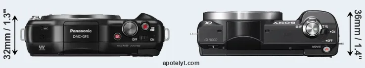 The side-by-side display below illustrates the physical size and weight of the Panasonic GF3 and the Sony A5000. The two cameras are presented according to their relative size. Three consecutive perspectives from the front, the top, and the back are available. All width, height and depth measures are rounded to the nearest millimeter.