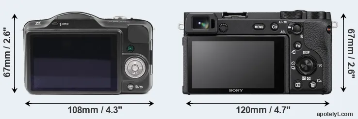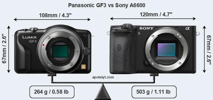 The side-by-side display below illustrates the physical size and weight of the Panasonic GF3 and the Sony A6600. The two cameras are presented according to their relative size. Three successive views from the front, the top, and the rear are shown. All width, height and depth dimensions are rounded to the nearest millimeter.