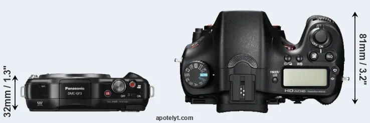 The side-by-side display below illustrates the physical size and weight of the Panasonic GF3 and the Sony A77. The two cameras are presented according to their relative size. Three consecutive views from the front, the top, and the rear side are shown. All size dimensions are rounded to the nearest millimeter.