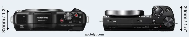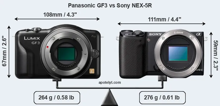 An illustration of the physical size and weight of the Panasonic GF3 and the Sony NEX-5R is provided in the side-by-side display below. The two cameras are presented according to their relative size. Three consecutive views from the front, the top, and the rear side are shown. All width, height and depth dimensions are rounded to the nearest millimeter.