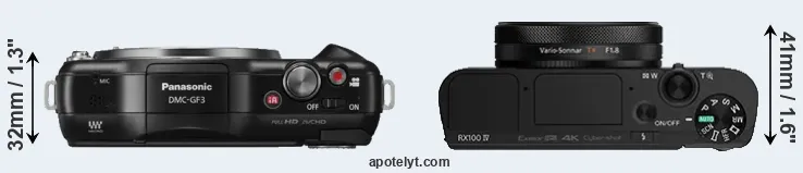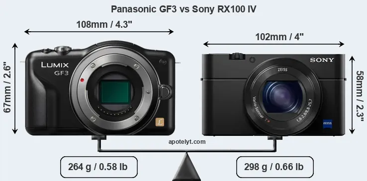 The physical size and weight of the Panasonic GF3 and the Sony RX100 IV are illustrated in the side-by-side display below. The two cameras are presented according to their relative size. Three successive views from the front, the top, and the rear are shown. All width, height and depth measures are rounded to the nearest millimeter.