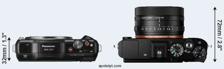 An illustration of the physical size and weight of the Panasonic GF3 and the Sony RX1R II is provided in the side-by-side display below. The two cameras are presented according to their relative size. Three successive views from the front, the top, and the rear are shown. All width, height and depth measures are rounded to the nearest millimeter.