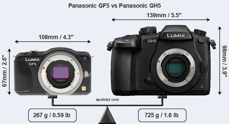 If the front view area (width x height) of the cameras is taken as an aggregate measure of their size, the Panasonic GH5 is considerably larger (88 percent) than the Panasonic GF5. Moreover, the GH5 is substantially heavier (172 percent) than the GF5. It is noteworthy in this context that the GH5 is splash and dust-proof, while the GF5 does not feature any corresponding weather-sealing.