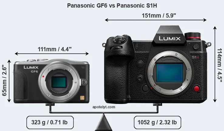 If the front view area (width x height) of the cameras is taken as an aggregate measure of their size, the Panasonic S1H is considerably larger (139 percent) than the Panasonic GF6. Moreover, the S1H is substantially heavier (226 percent) than the GF6. It is noteworthy in this context that the S1H is splash and dust-proof, while the GF6 does not feature any corresponding weather-sealing.