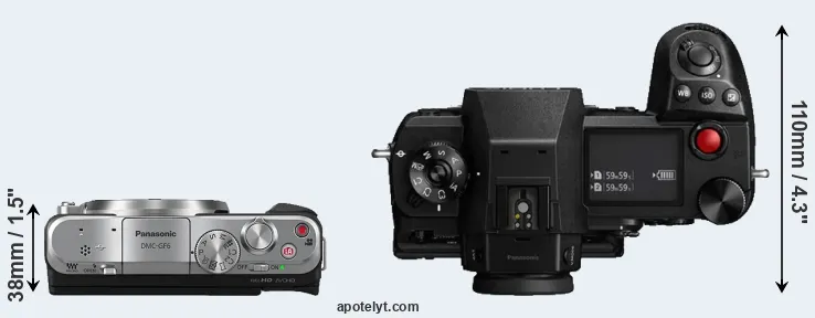 The physical size and weight of the Panasonic GF6 and the Panasonic S1H are illustrated in the side-by-side display below. The two cameras are presented according to their relative size. Three consecutive views from the front, the top, and the rear side are shown. All size dimensions are rounded to the nearest millimeter.