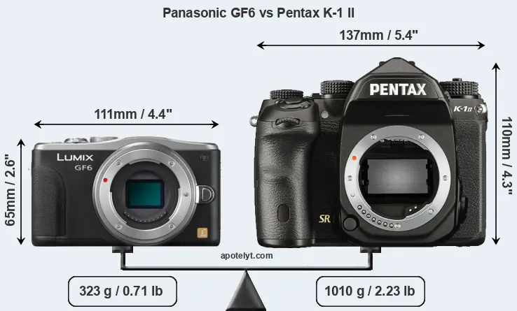 If the front view area (width x height) of the cameras is taken as an aggregate measure of their size, the Pentax K-1 II is considerably larger (109 percent) than the Panasonic GF6. Moreover, the K-1 II is substantially heavier (213 percent) than the GF6. It is noteworthy in this context that the K-1 II is splash and dust-proof, while the GF6 does not feature any corresponding weather-sealing.