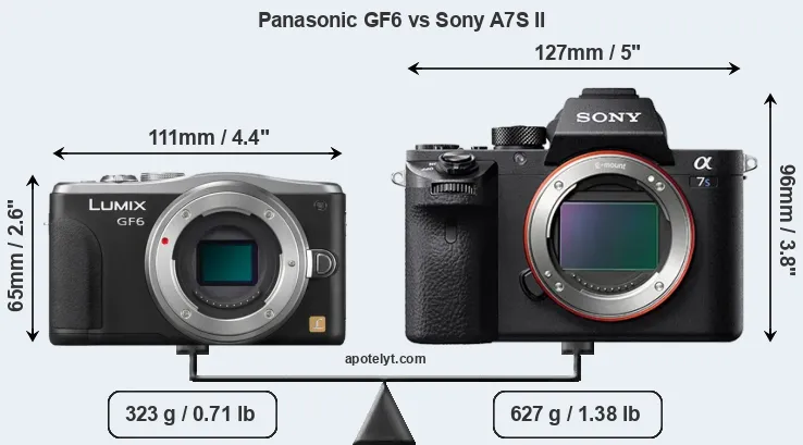 If the front view area (width x height) of the cameras is taken as an aggregate measure of their size, the Sony A7S II is considerably larger (69 percent) than the Panasonic GF6. Moreover, the A7S II is substantially heavier (94 percent) than the GF6. It is noteworthy in this context that the A7S II is splash and dust-proof, while the GF6 does not feature any corresponding weather-sealing.