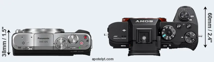The physical size and weight of the Panasonic GF6 and the Sony A7S II are illustrated in the side-by-side display below. The two cameras are presented according to their relative size. Three consecutive perspectives from the front, the top, and the back are available. All width, height and depth measures are rounded to the nearest millimeter.