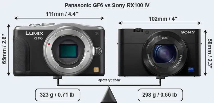 An illustration of the physical size and weight of the Panasonic GF6 and the Sony RX100 IV is provided in the side-by-side display below. The two cameras are presented according to their relative size. Three consecutive views from the front, the top, and the rear side are shown. All width, height and depth dimensions are rounded to the nearest millimeter.