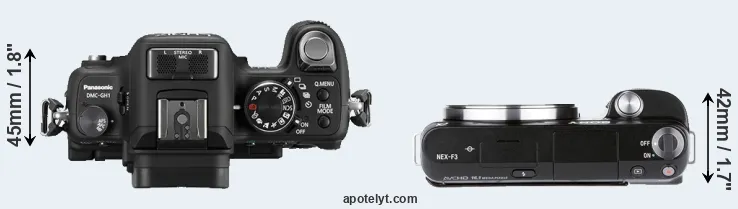 The side-by-side display below illustrates the physical size and weight of the Panasonic GH1 and the Sony NEX-F3. The two cameras are presented according to their relative size. Three successive views from the front, the top, and the rear are shown. All size dimensions are rounded to the nearest millimeter.