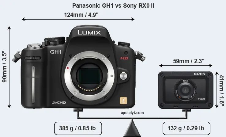 If the front view area (width x height) of the cameras is taken as an aggregate measure of their size, the Sony RX0 II is considerably smaller (78 percent) than the Panasonic GH1. It is noteworthy in this context that the RX0 II is splash and dust-proof, while the GH1 does not feature any corresponding weather-sealing. More than that, the RX0 II is water-proof up to 10m and can, thus, be used for underwater photography.