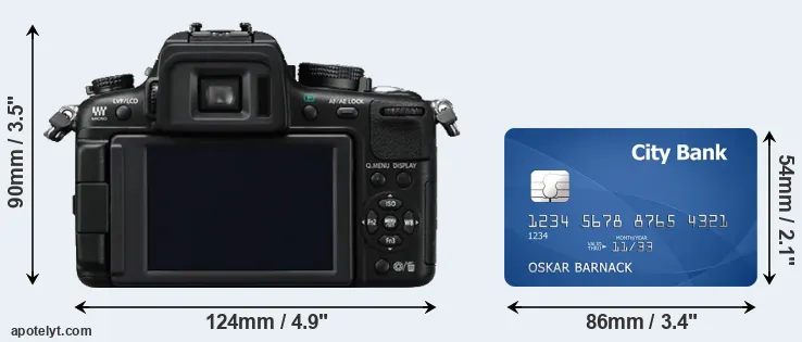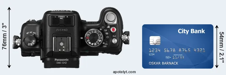 An illustration of the physical dimensions of the Panasonic GH2 vis-à-vis a credit card is provided in the side-by-side display below. Three consecutive perspectives from the front, the top, and the back are presented. All width, height and depth dimensions are rounded to the nearest millimeter.