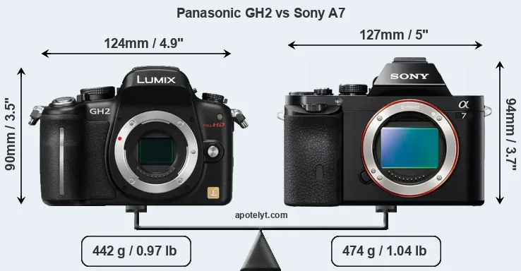 If the front view area (width x height) of the cameras is taken as an aggregate measure of their size, the Sony A7 is notably larger (7 percent) than the Panasonic GH2. Moreover, the A7 is markedly heavier (7 percent) than the GH2. It is noteworthy in this context that the A7 is splash and dust-proof, while the GH2 does not feature any corresponding weather-sealing.
