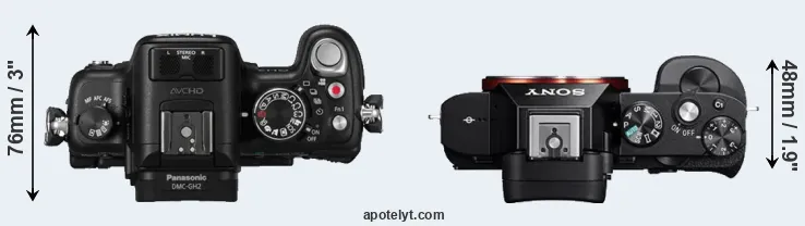 The physical size and weight of the Panasonic GH2 and the Sony A7 are illustrated in the side-by-side display below. The two cameras are presented according to their relative size. Three successive views from the front, the top, and the rear are shown. All width, height and depth measures are rounded to the nearest millimeter.