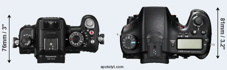 An illustration of the physical size and weight of the Panasonic GH2 and the Sony A77 is provided in the side-by-side display below. The two cameras are presented according to their relative size. Three successive views from the front, the top, and the rear are shown. All size dimensions are rounded to the nearest millimeter.