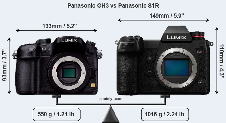 An illustration of the physical size and weight of the Panasonic GH3 and the Panasonic S1R is provided in the side-by-side display below. The two cameras are presented according to their relative size. Three successive views from the front, the top, and the rear are shown. All width, height and depth dimensions are rounded to the nearest millimeter.