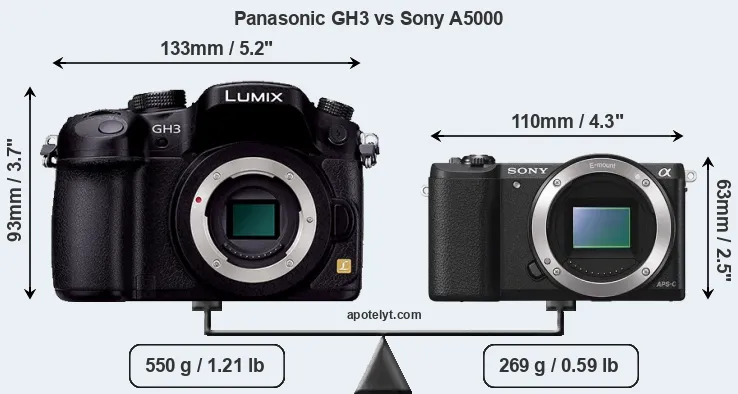The side-by-side display below illustrates the physical size and weight of the Panasonic GH3 and the Sony A5000. The two cameras are presented according to their relative size. Three consecutive perspectives from the front, the top, and the back are available. All size dimensions are rounded to the nearest millimeter.