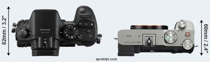 An illustration of the physical size and weight of the Panasonic GH3 and the Sony A7C is provided in the side-by-side display below. The two cameras are presented according to their relative size. Three successive views from the front, the top, and the rear are shown. All width, height and depth dimensions are rounded to the nearest millimeter.