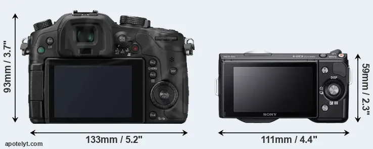 If the front view area (width x height) of the cameras is taken as an aggregate measure of their size, the Sony NEX-5N is considerably smaller (47 percent) than the Panasonic GH3. Moreover, the NEX-5N is substantially lighter (51 percent) than the GH3. It is worth mentioning in this context that the GH3 is splash and dust resistant, while the NEX-5N does not feature any corresponding weather-sealing.