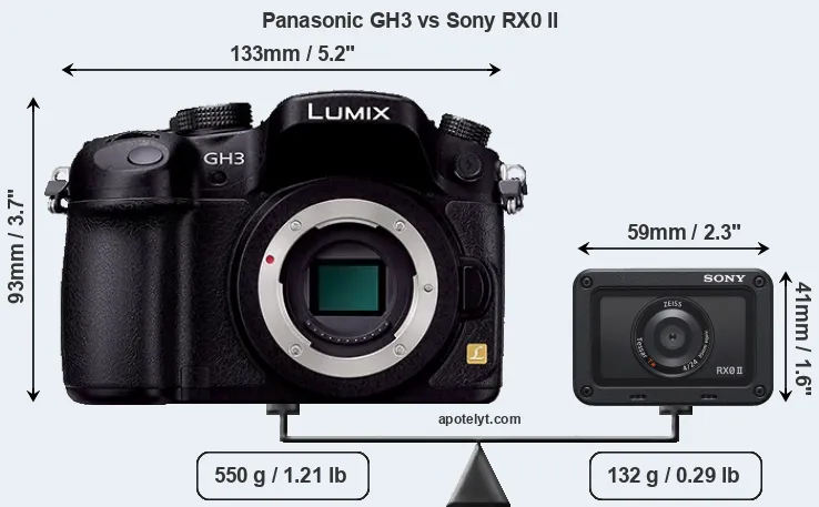 An illustration of the physical size and weight of the Panasonic GH3 and the Sony RX0 II is provided in the side-by-side display below. The two cameras are presented according to their relative size. Three consecutive views from the front, the top, and the rear side are shown. All size dimensions are rounded to the nearest millimeter.