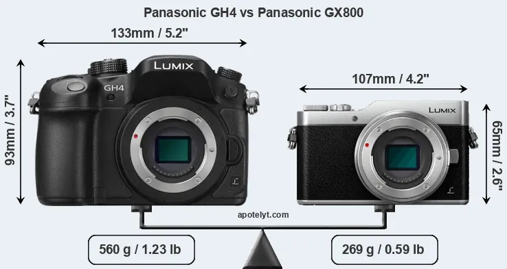 If the front view area (width x height) of the cameras is taken as an aggregate measure of their size, the Panasonic GX800 is considerably smaller (44 percent) than the Panasonic GH4. Moreover, the GX800 is substantially lighter (52 percent) than the GH4. It is worth mentioning in this context that the GH4 is splash and dust resistant, while the GX800 does not feature any corresponding weather-sealing.